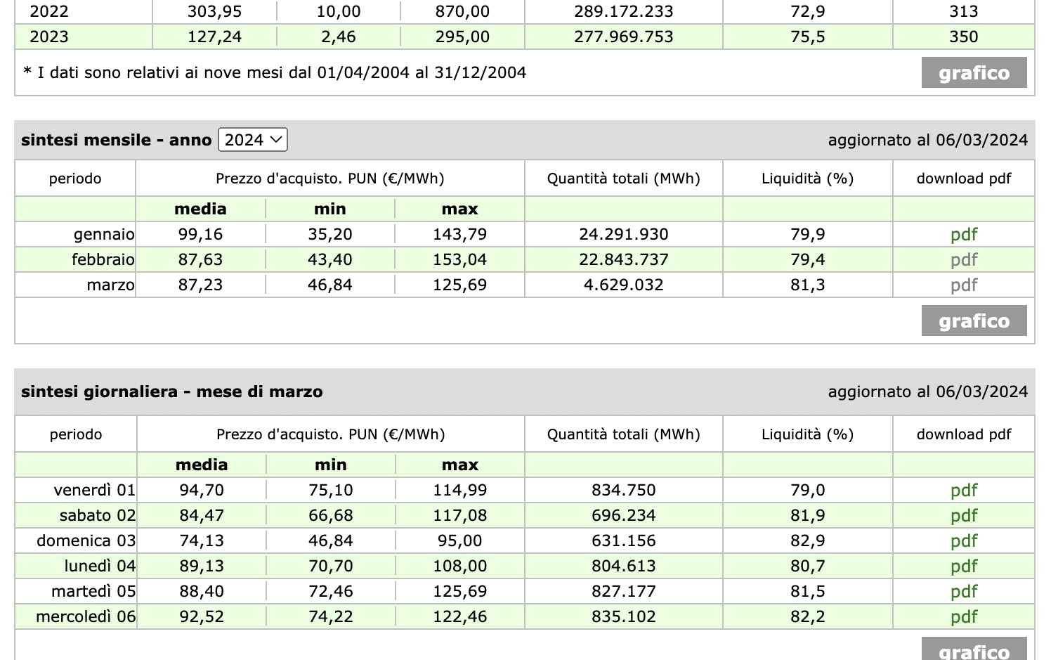 il PUN di marzo 2024 fino ad oggi 06/03/2024 è di 0,0872 ossia 0,08 cent/kWh